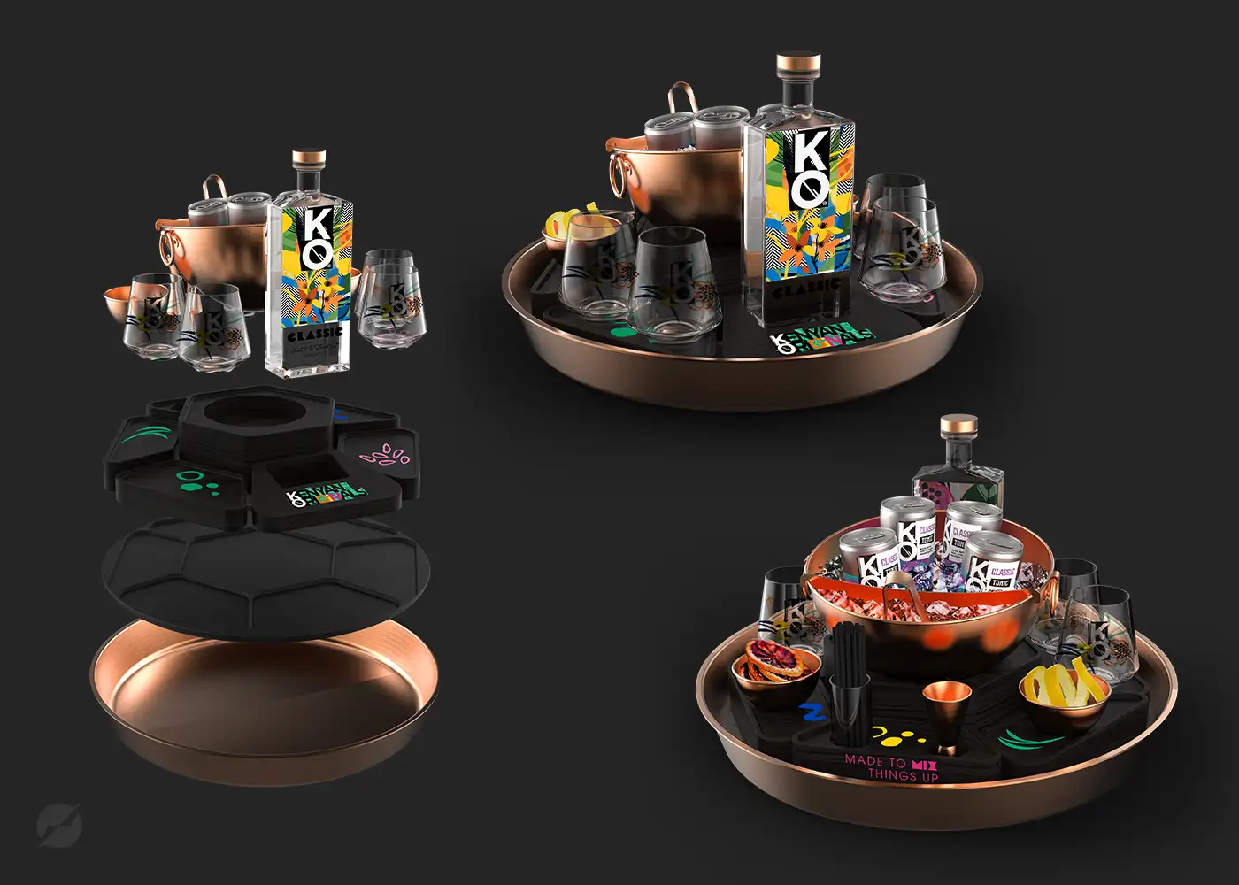 This modular collection defines the KO Gin ritual across every touchpoint, from high-energy festivals to luxury travel retail. Designed for maximum logistical flexibility, the range spans from portable festival trolleys to fixed Duty Free minibars. The architecture focuses on « functional prestige, » adapting to diverse environments while maintaining a premium identity. Whether as a compact service tray or a large-scale mobile station, each asset prioritizes professional flow and durability, ensuring a consistent brand experience regardless of the venue’s scale.