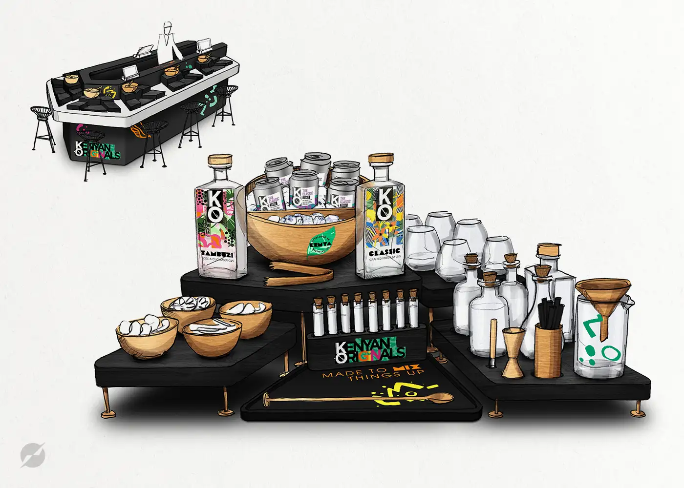 A sculptural landscape for the art of mixology. Designed exclusively for the KO Kraft Room in Nairobi, this bespoke structural ecosystem defines the premium ritual of Kenyan Originals’ gin portfolio. The project features a modular « Cocktail Experience » set, where sculptural forms meet professional ergonomics to facilitate immersive mixology classes. Each element is engineered as a functional stand that translates the brand’s dynamic energy into a physical landscape. By balancing bold geometry with site-specific requirements, the collection elevates the drinking ritual, turning a standard masterclass into a high-end, tactile brand experience at the heart of the KO flagship.