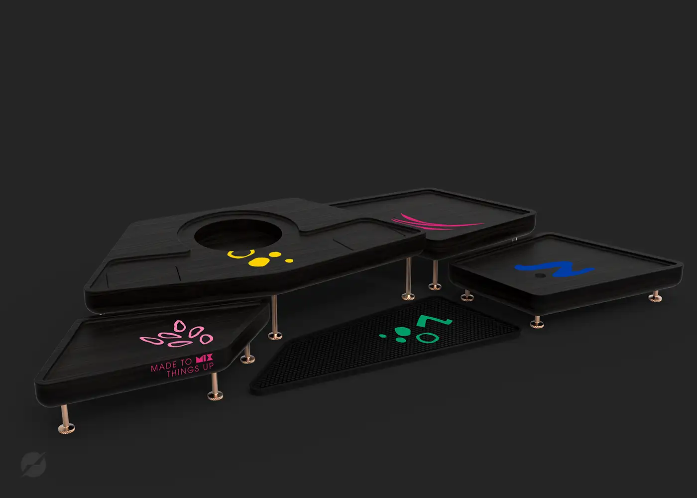 A bold, narrative table-serve experience inspired by the vibrant energy of Kenyan bus culture. Developed directly for Alexandra Chappatte (CEO & Founder of African Originals), this project features a spiraling « roadway » for shot glass service, detailed with a rugged, tire-tread rubber texture. An integrated LED strip provides focal illumination, merging urban storytelling with high-end hospitality rituals. This piece creates a disruptive, communal brand experience that celebrates the spirit of Kenyan distillation.