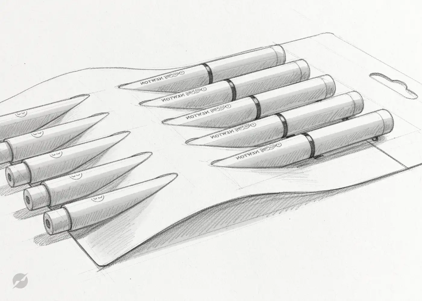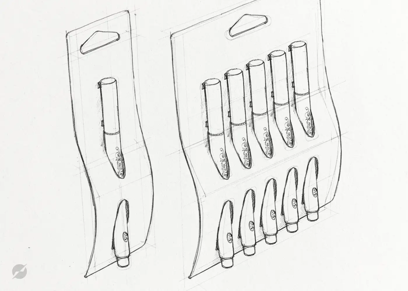 A masterclass in structural reduction—stripping away the superfluous to celebrate the instrument. Developed for Lewis Moberly through intuitive sketching and physical mockups, this design prioritizes a minimal, single component waste architecture, eliminating adhesives and excess material. The result is a sleek, self-supporting frame that transitions seamlessly from a protective pack to an elegant desktop display.