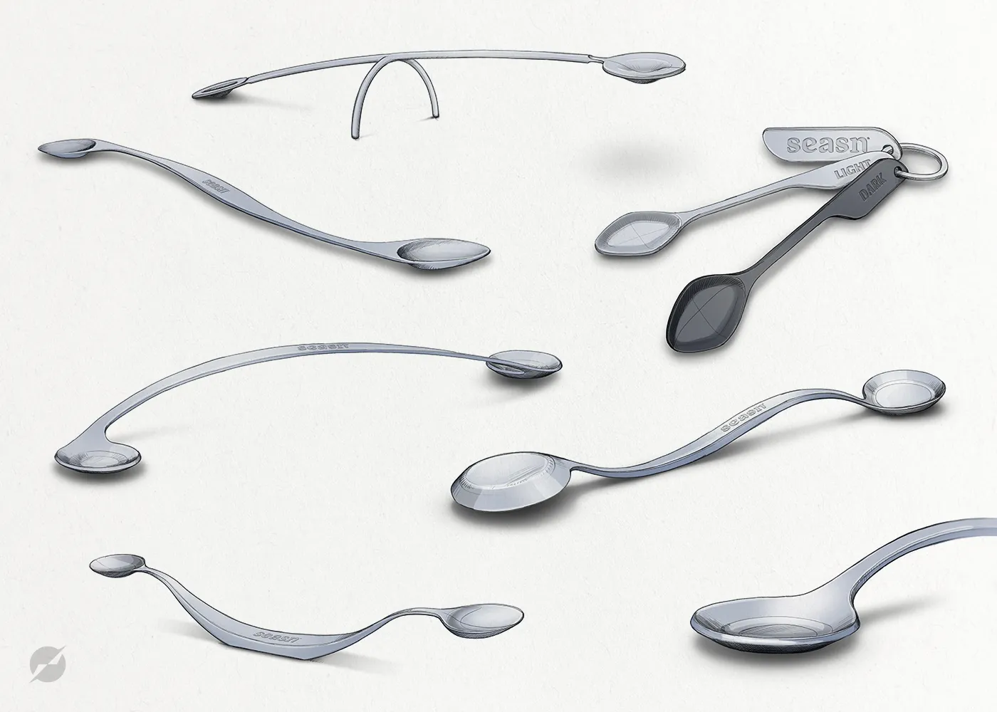 A bespoke duo of sensory tools designed for professional brand advocacy. These tasting spoons—one polished, one frosted—were engineered as a tactile extension of the brand’s nature-inspired visual identity. Attached to a signature keyring for portability, the organic silhouettes allow brand ambassadors to present the bitters to bartenders through a refined, consistent ritual. This project merges ergonomic CAD modeling with specialized finish specifications to translate graphic poetry into a functional metallic object.